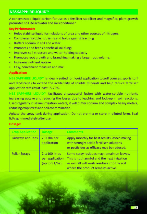 NBS SAPPHIRE LIQUID is ideally suited for liquid application to golf courses, sports turf and landscapes to extend the availability of soluble minerals and help reduce fertiliser application rates by at least 15-20%.