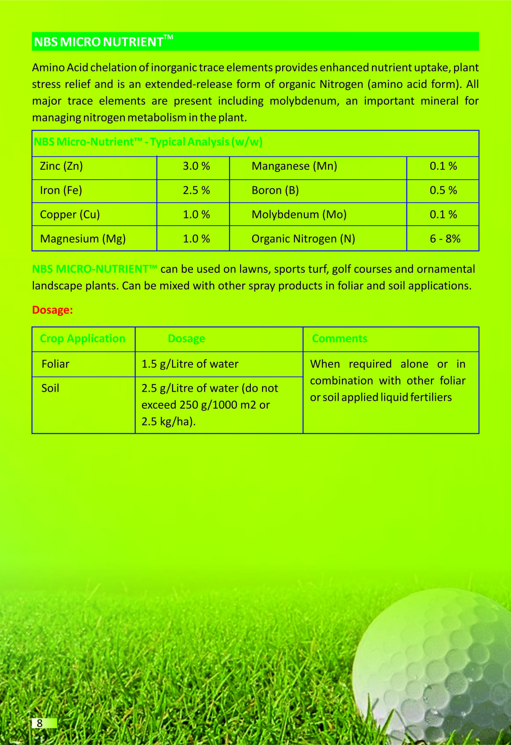 NBS MICRO NUTRIENT™ can be used on grain crops, vegetable, fruit crops, lawns, turf, floriculture, ornamental plants. Can be mixed with other foliar spray products as well as soil application through drip irrigation, fertigation system or drenching.